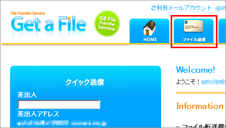 1 Get a File にログイン後、上部メニューの【ファイル送信】をクリックします。