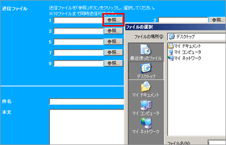 3 「送信ファイル」にて【参照】ボタンをクリックし、送信するファイルを選択します。