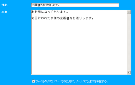 Get a File では、通常のメールでは送信できないような大容量のファイルをウェブメールのような操作で送信できます。 送信履歴(メールの文章やファイル)を保存しているので、以前送った宛先へ同様のファイルを再送することも可能です。