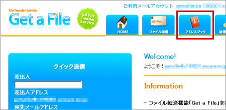 1 Get a File にログイン後、上部メニューの【アドレスブック】をクリックします。