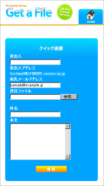 クリックしたメールアドレスがクイック送信画面の宛先メールアドレスに自動入力されます。必要事項を入力しファイルの送信が可能になります。