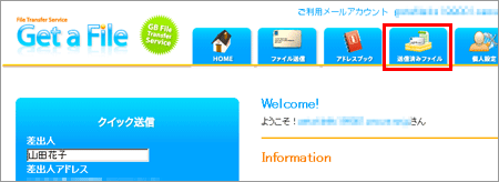 1 Get a File にログイン後、上部メニューの【送信済みファイル】をクリックします。