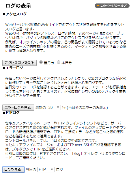 | エラーログ | 存在しないページに対してアクセスしようとしたり、 CGI のプログラムが正常に動作せずエラーを起こしたりしたときに記録されるログです。 当日分のエラーログから、最新の 20 行、 50 行、 100 行、 200 行を選択して表示できます。 |
