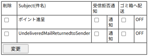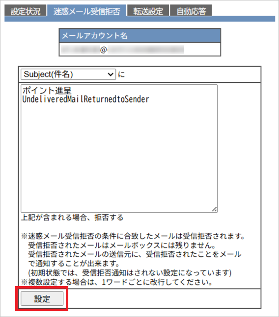 ■ スペースを入れない設定で、「Undelivered Mail Returned to Sender」という件名のメールを拒否することが可能です。