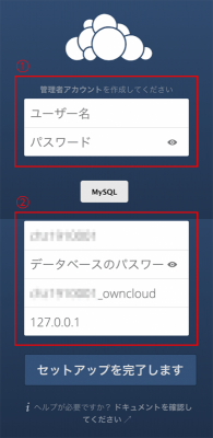 ① ownCloud で利用するユーザーの情報を入力します。