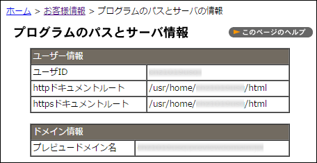 コントロールパネルの【お客様情報】から【プログラムのパスとサーバーの情報】をクリックしてください。