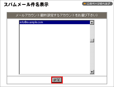 メールアカウントごとにスパムメール件名表示の設定ができます。設定を行いたいアカウントを選択して、【設定】ボタンをクリックします。