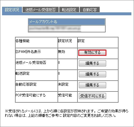 3 設定状況が表示されますので、「[SPAM] 件名表示」の【有効にする】ボタンをクリックします。