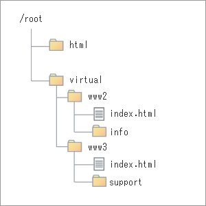 /virtual/www2/index.htmlがhttp://www2.example.jp/のトップページとなり、さらに /virtual/www2/info/index.htmlというファイルがあった場合には、URLは http://www2.example.jp/info/index.htmlとなります。