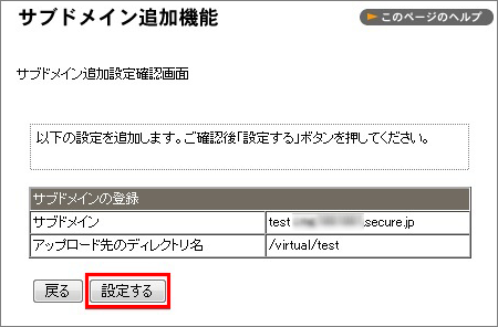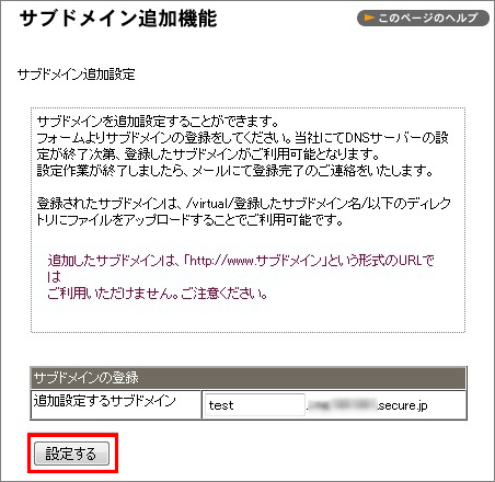 2 追加したいサブドメイン名を入力し【設定する】ボタンをクリックします。