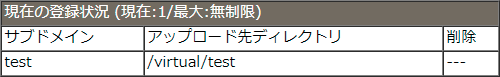 ■登録するサブドメインのアップロード先ディレクトリ(/virtual/登録したサブドメイン名/)が既に存在する場合はエラーになります。該当ディレクトリを削除してから登録作業を行ってください。
