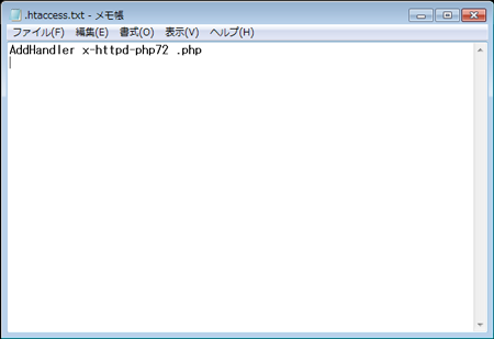 4 テキストファイルの1行目に、「AddHandler x-httpd-php72 .php」と入力し、改行をしてファイルを保存します。