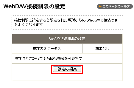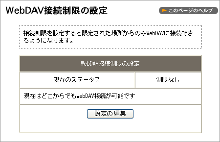 なにも設定されていない場合は、「現在のステータス」は「制限なし」「現在はどこからでも WebDAV 接続が可能です」になっています。