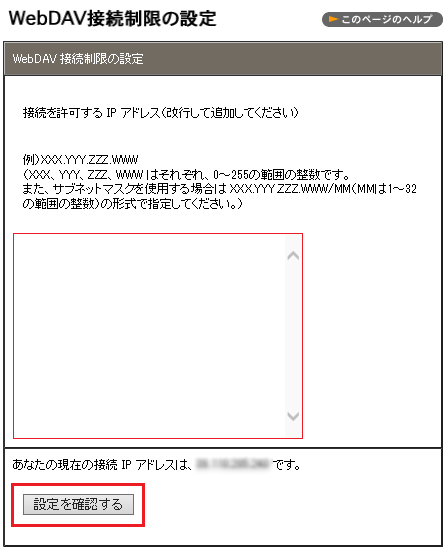 3 テキストエリアに「接続を許可する IP アドレス」を入力し、「設定を確認する」をクリックします。
