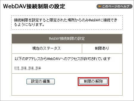 4 解除されると、「現在のステータス」は「制限なし」、「現在はどこからでも WebDAV 接続が可能です」に変わります。