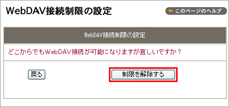 「どこからでも WebDAV 接続が可能になりますが宜しいですか?」と表示されますので「制限を解除する」をクリックします。