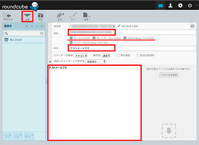 【送信】ボタンをクリックするとメール作成画面に切り替わり、宛先に連絡先で選択した方のメールアドレスが入力されます。