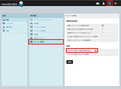メールを完全に削除をする場合には、右上の設定から「サーバーの設定」をクリックして「メンテナンス設定の「ログアウト時にごみ箱を空にする」にチェックを入れて、保存をします。