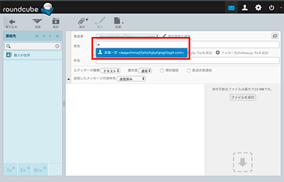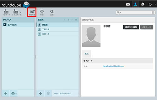1 Roundcube 画面中央の【連絡先】メニュー下部より、【連絡先の新規作成】を選択します。