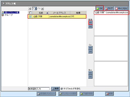 送信先とするアドレスにチェックを入れて「宛先」の【 >> 】(右矢印ボタン)をクリックすると、画面右側の表示欄にメールアドレスが入力されます。この状態で【OK】をクリックすると、宛先として入力されます。