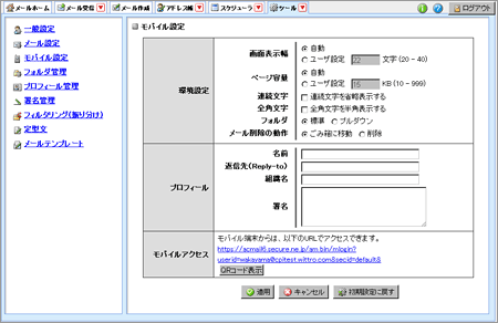 3 【モバイル設定】の「モバイルアクセス」に記載されている URL 、または【QR コード表示】より携帯電話用の Active! mail ログイン画面 URL を取得してください