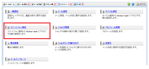 2 Active! mail の画面上部の【ツール】をクリックし、【モバイル設定】をクリックします