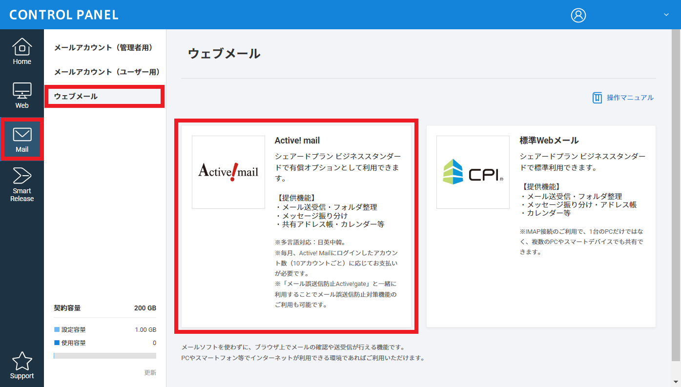 1 コントロールパネルにて【Mail】>【ウェブメール】>【Active! mail】とクリックし、Active! mail ログイン画面にアクセスします
