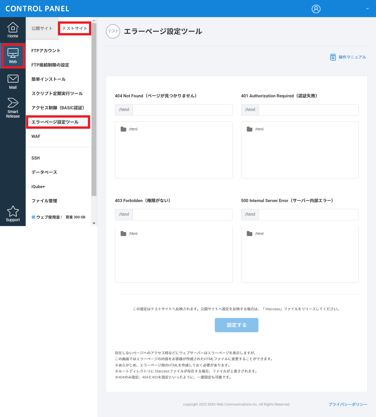 2 コントロールパネルにて【Web】>【テストサイト】>【エラーページ設定ツール】とクリックします