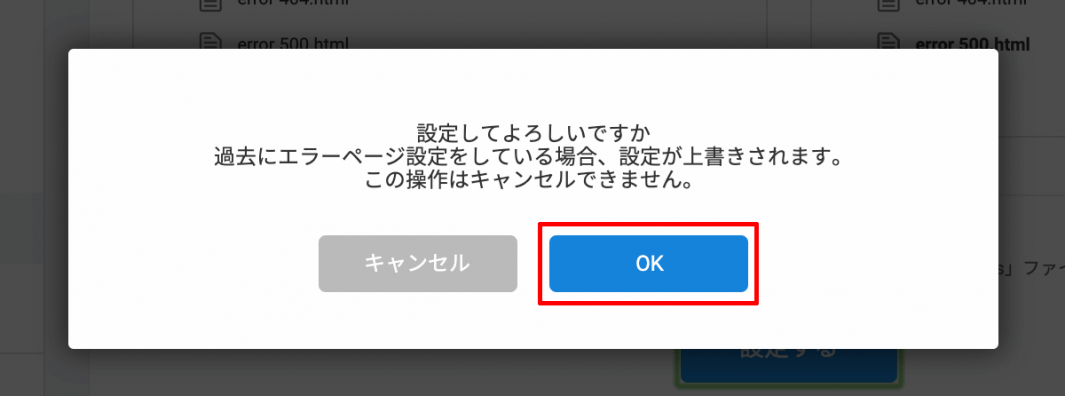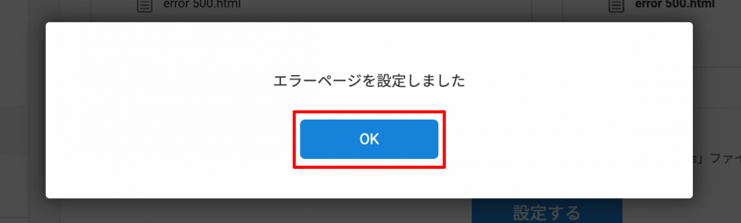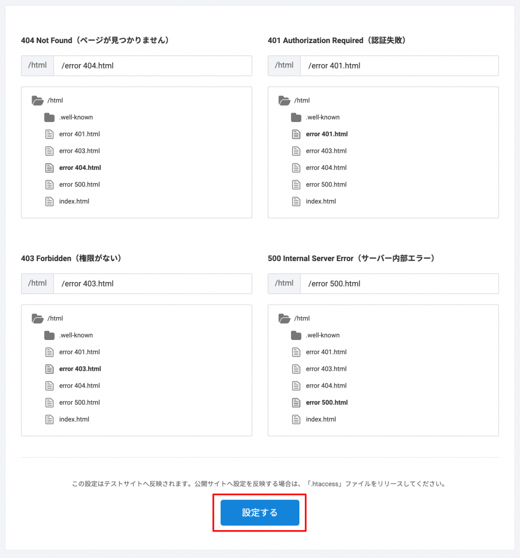 3 設定したいエラーコードに対して、アップロードしたエラーページ用ファイルを指定して【設定する】をクリックします