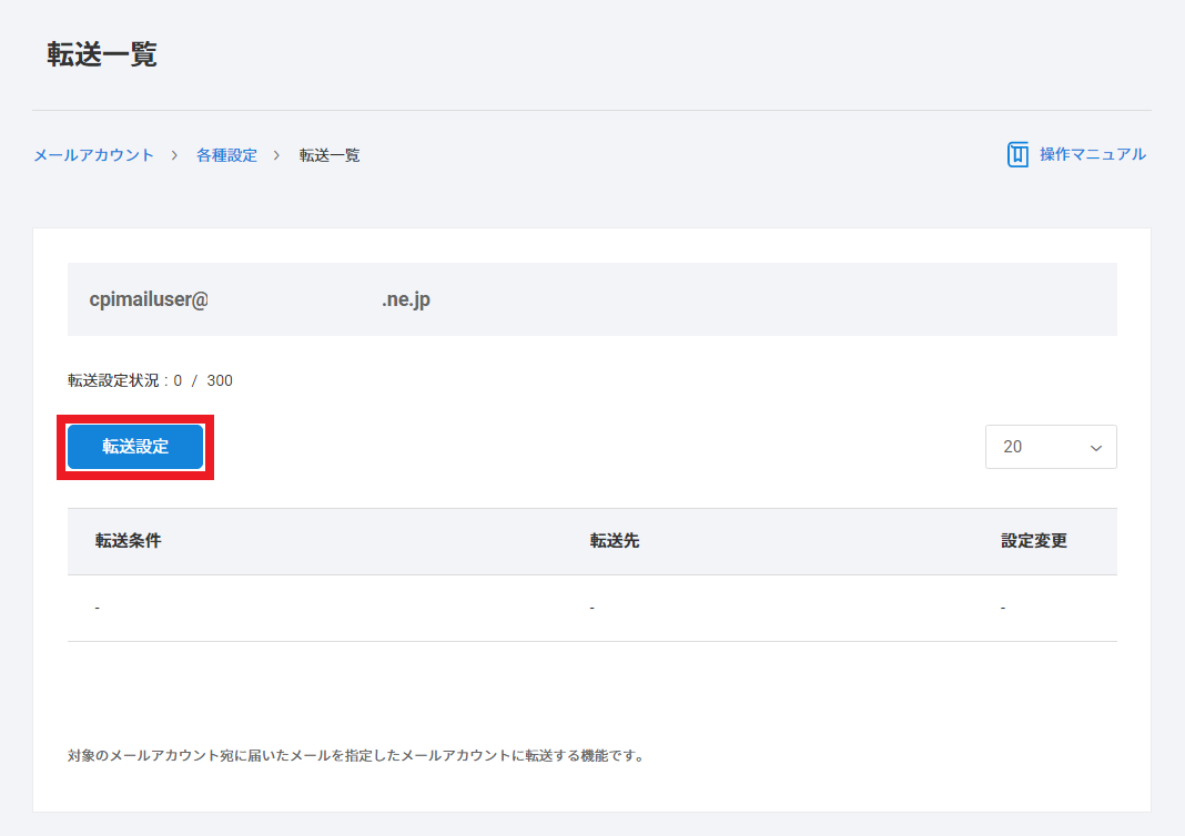 なお、転送設定の上限値は「300」となりますが、こちらの値は「設定数」ではなく「転送先として登録されたアカウント数」になります。