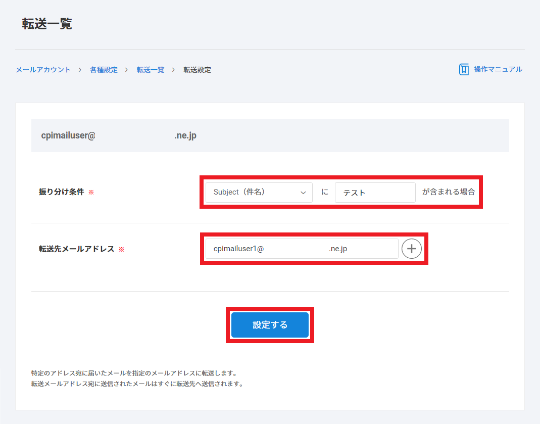 4 振り分け条件、転送先メールアドレスを入力して【設定する】をクリックします