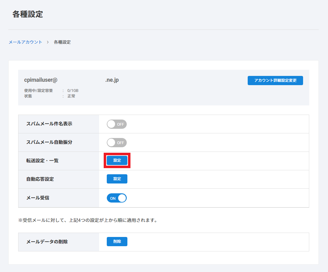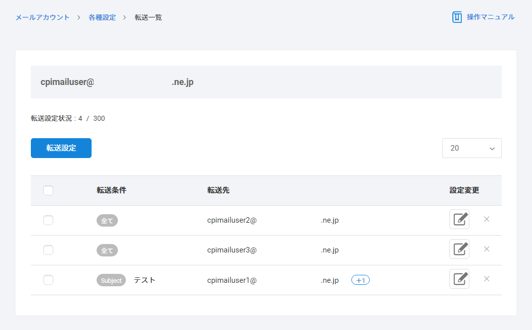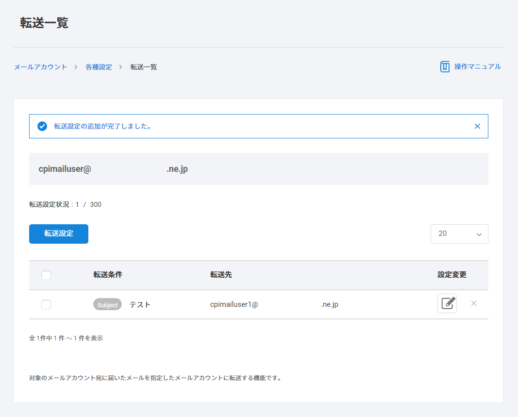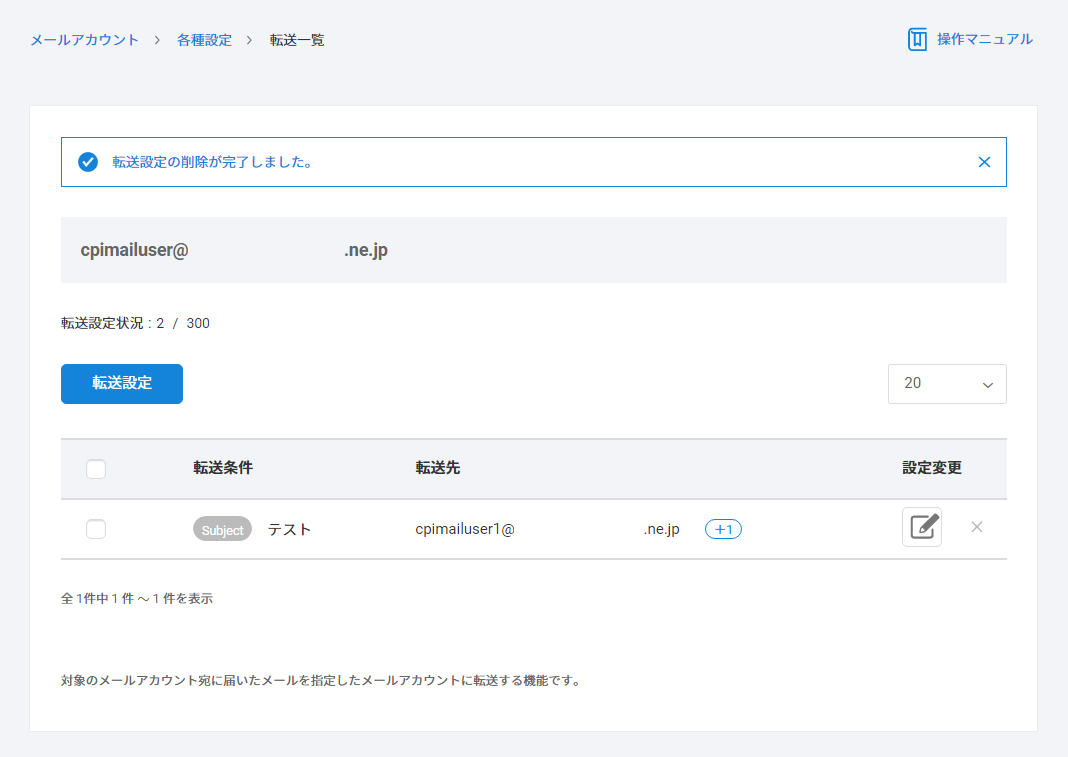 また、転送先アドレスの追加/一部削除はおこなえないため、そういった対応が必要な場合、該当の設定登録を一旦削除したうえ、再登録していただく必要があります。
