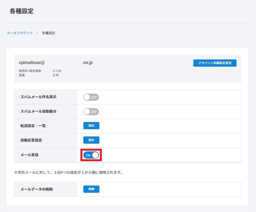 そのため、「OFF(受信不可)」に設定されたメールアカウントは、送信専用や転送中継用といった特殊用途のアドレスとなる点にご注意ください。