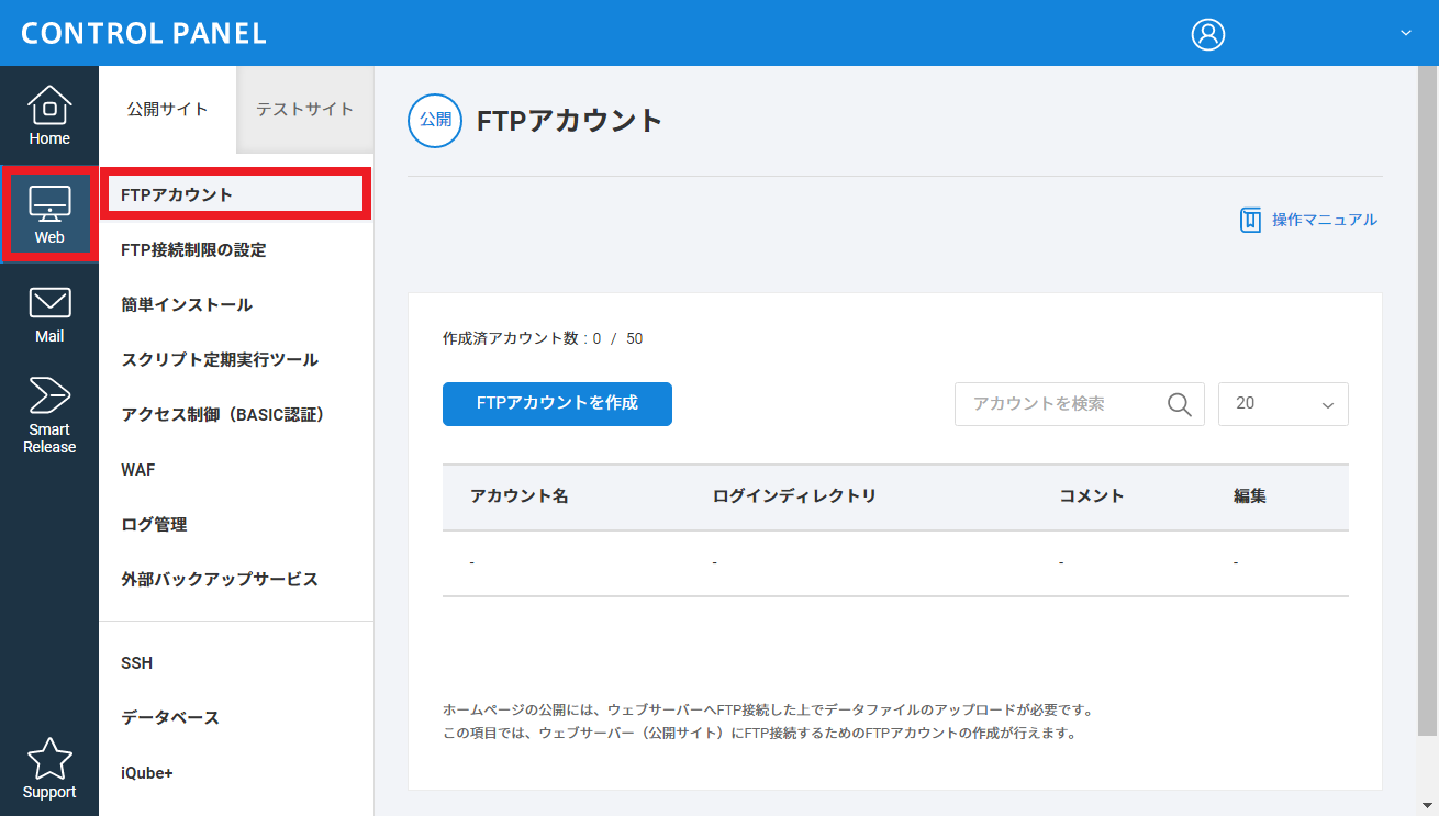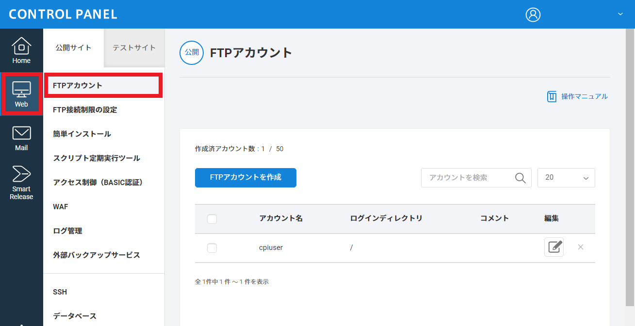 1 コントロールパネルにて【Web】>【公開サイト】>【FTP アカウント】とクリックします