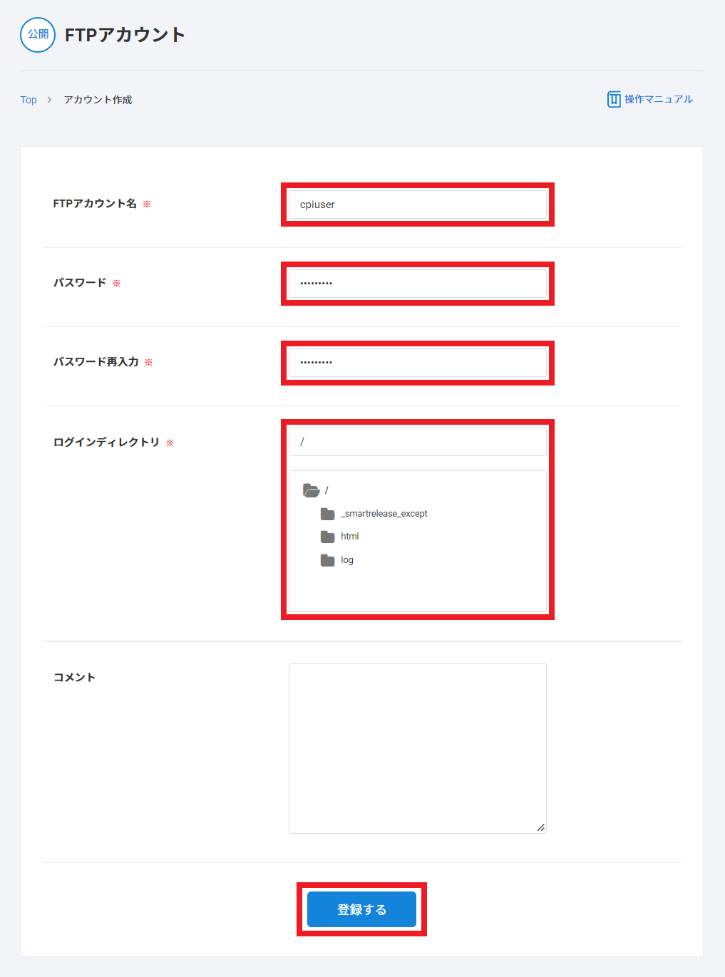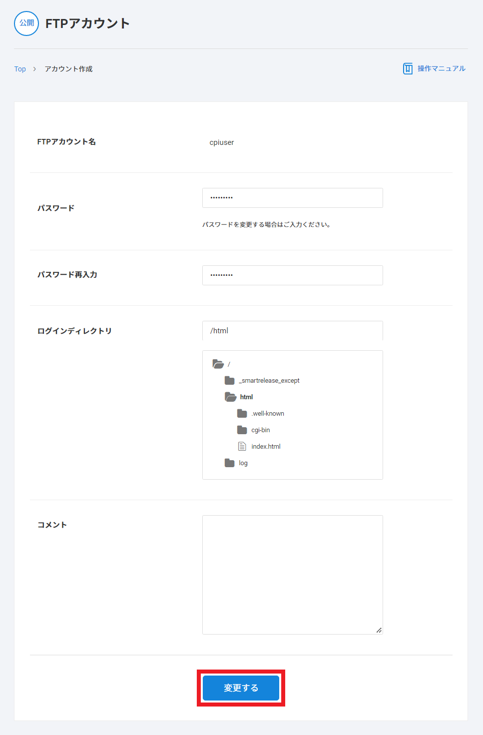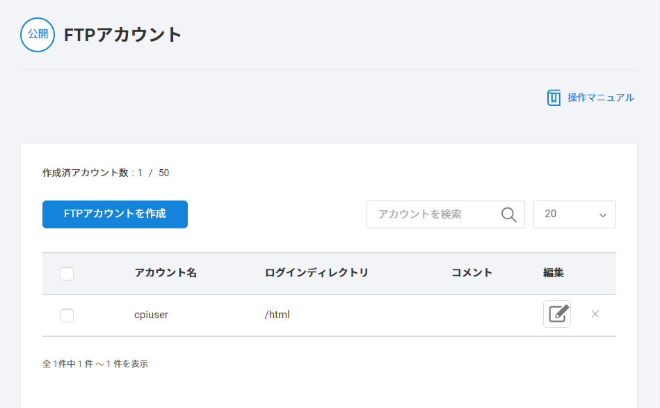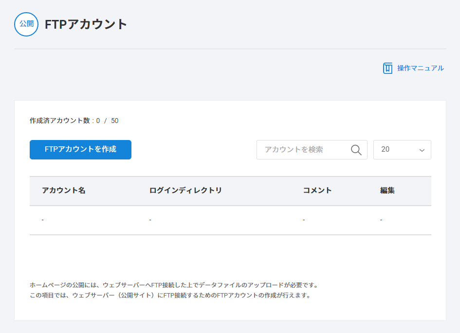 - 上記は「公開サイト用の FTP アカウントを作成する場合」となります。