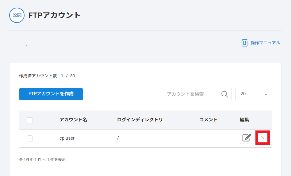 2 削除したい FTP アカウントの【×】(削除)をクリックします
