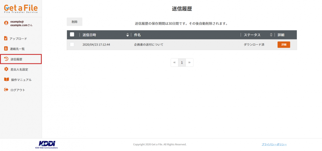 「Get a File」で送信したファイルと送信履歴は、30 日間サーバーに保管されます。30 日間を過ぎますと自動的に削除され、送付先からのダウンロードも行えなくなります。