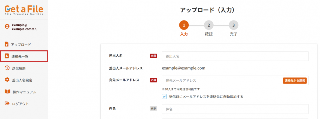 1 Get a File にログイン後、左部メニューの【連絡先一覧】をクリックします。