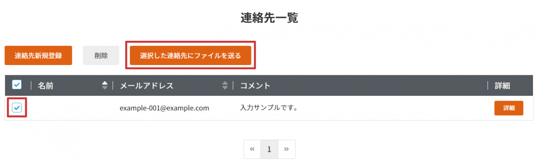 1 連絡先一覧から、登録済みメールアドレスの左端のチェックボックスにチェックをいれ、【選択した連絡先にファイルを送る】をクリックします。