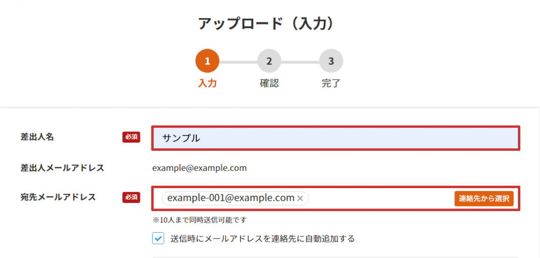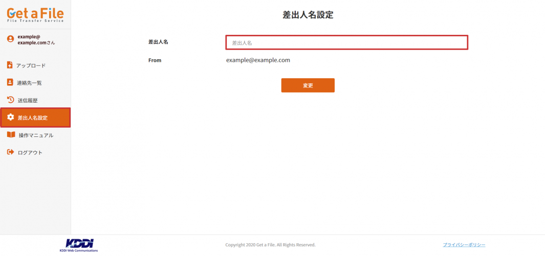 差出人名を指定すると、アップロード画面の差出人欄に自動で入力されます。