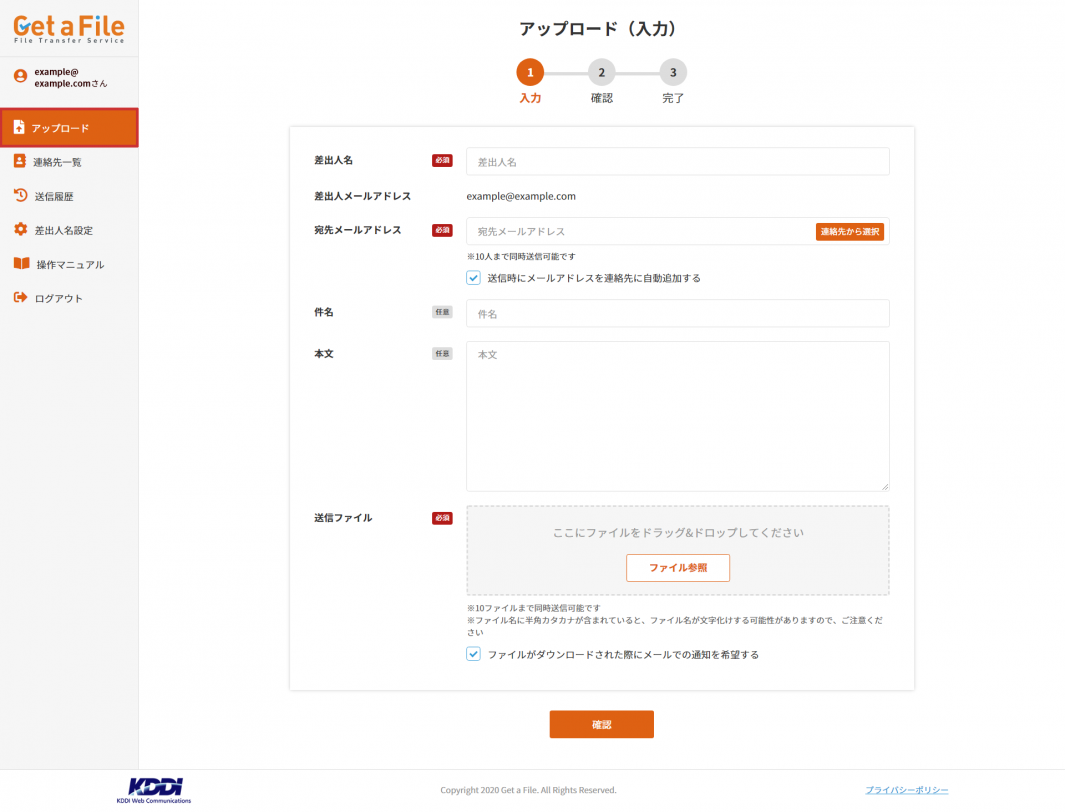 1 Get a File にログイン後は、左部メニューの【アップロード】が開かれます。