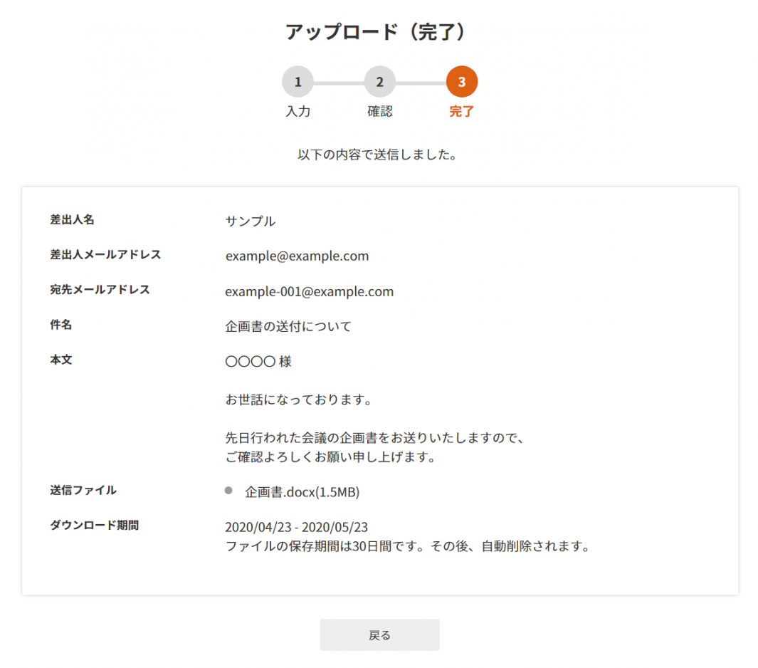 「Get a File」で送信したファイルと送信履歴は、30 日間サーバーに保管されます。30 日間を過ぎますと自動的に削除され、送付先からのダウンロードも行えなくなります。