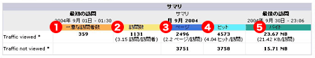 | 統計 | サイト全体の、該当月のアクセス数を示します。 一意の訪問者数、訪問者ののべ数、アクセスされたページ数、ヒット数(HTML のほかに、画像も含まれます)、バイト数(アクセスされたファイルのファイルサイズ)について表示します。 |