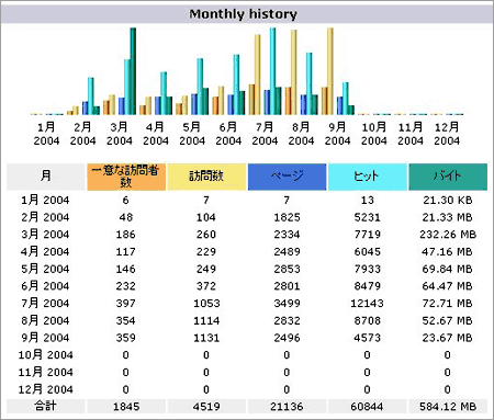 1 年分の月毎のサマリを、棒グラフと表で表示したものです。どの月にアクセスが多かったのかがわかります。