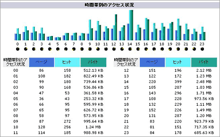 該当月の日毎の「訪問数」「ページ」「ヒット」「バイト」棒グラフと表で表示したものです。どの日にアクセスが多かったのかがわかります。