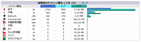 | 訪問者のドメイン/国名 | 訪問者のホスト名から国別の訪問数をまとめます。 |