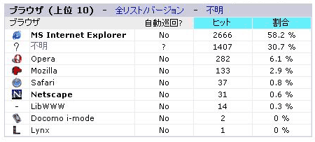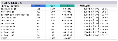 訪問者のホスト名のベスト 10 です。 Blog をやっていて、 SNS(ソーシャルネットワーキングサービス)の日記に登録している人は、 SNS のサーバーからのアクセスが上位に来ているかもしれません。