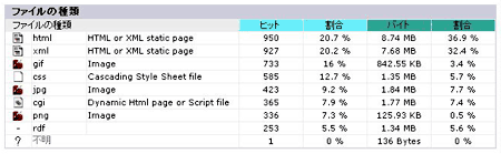 | ファイルの種類 | アクセスされたファイルの種類を表示します。 例えば、サイト内に 100 ページの HTML があった場合、もしそのうちの 20 ページにアクセスがあれば、 20 と表示します。残りの 80 ページにはアクセスがなかったと考えることができます。 |