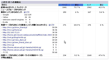 | このサイトへの接続元 | 訪問者がサイトへどのようにアクセスしてきたかを示します。 直接 URL を入力したか、検索サイトからアクセスしたか、などを表示します。 |