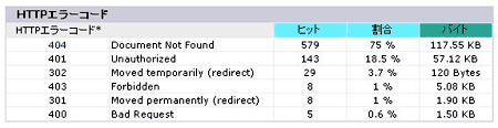 Web サーバーが返したエラーコードの種類を多い順に表示しています。たとえば、 404 は存在しない URL へのアクセスです。